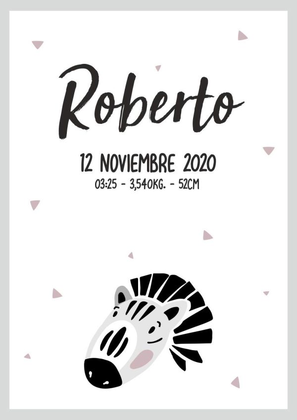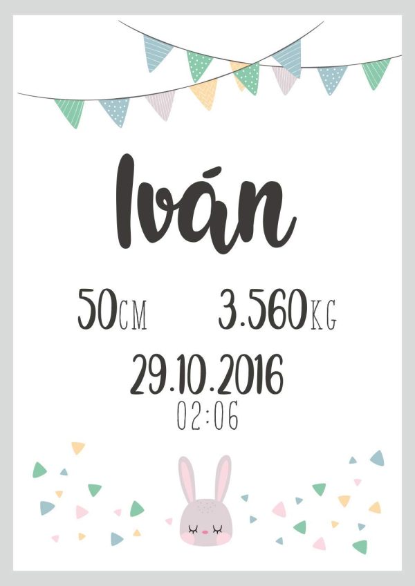 Recuerdo natalicio de tamaño A4 (29,7 x 21 cm) personalizado con los datos de nacimiento de tu bebé. Impreso en papel brillo de 180 gr. de calidad. Se envía una lámina personalizada con los datos del cliente (elige entre lámina o marco).